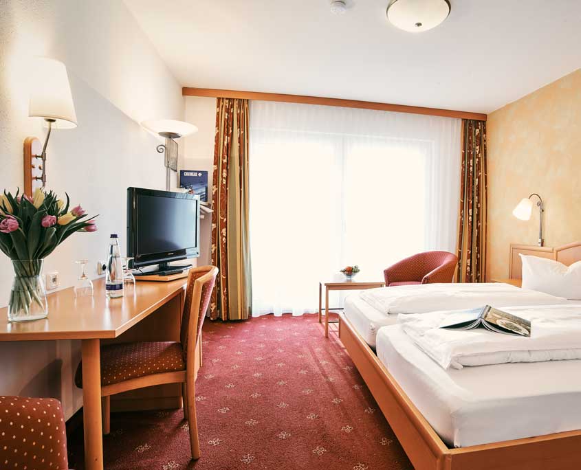 - Flasche Adelholzener Mineralwasser auf dem Zimmer